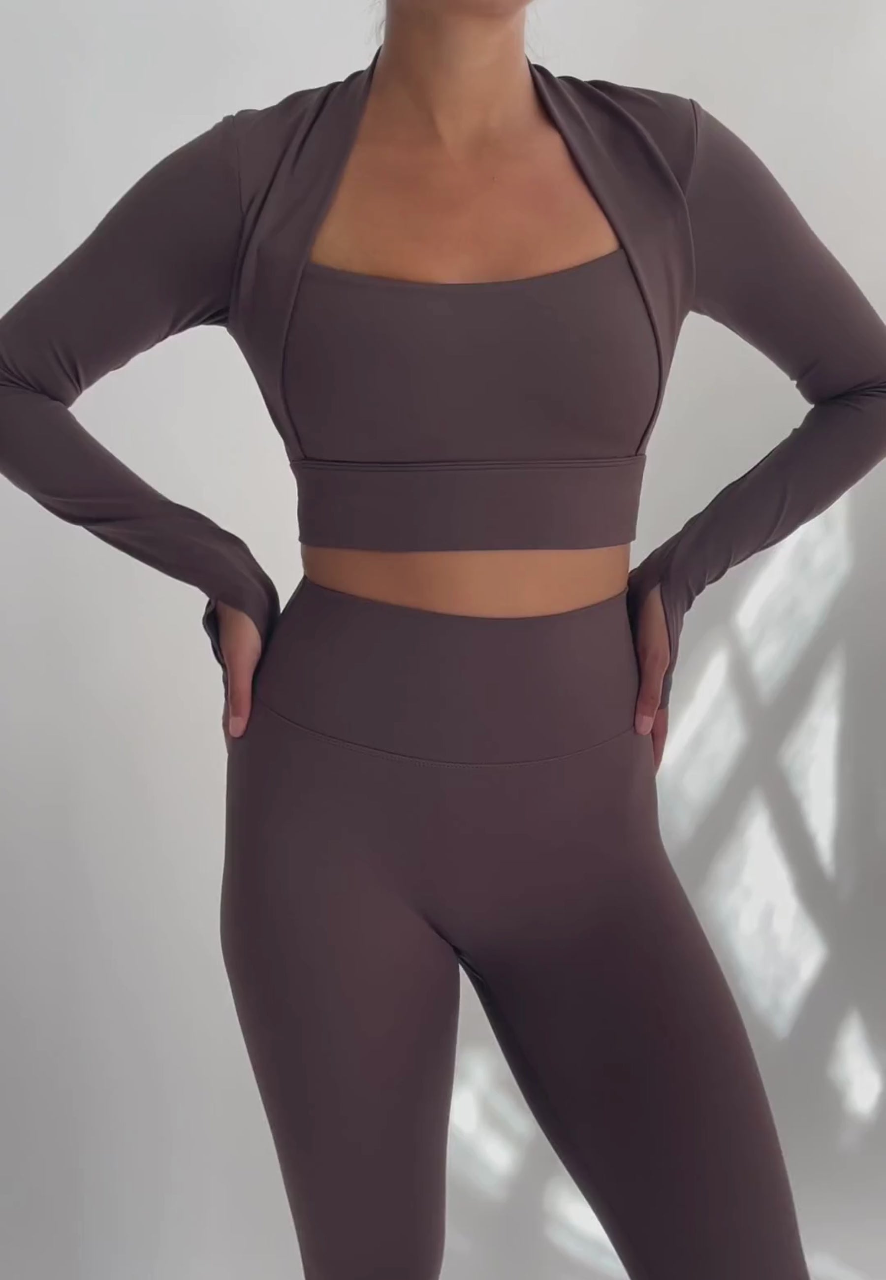 The Bolero Long Sleeve Top is the perfect combination of comfort and style. This flattering top with its hugging fit will turn heads while entering the studio! A minimal yet stylish design, perfect for low/medium impact workouts such as yoga or pilates. Made from our loved buttery soft fabric, with thumbholes and removable pads.
