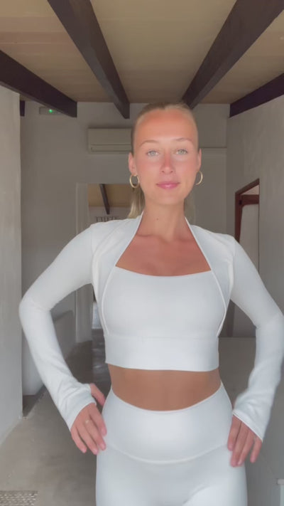 The Bolero Long Sleeve Top is the perfect combination of comfort and style. This flattering top with its hugging fit will turn heads while entering the studio! A minimal yet stylish design, perfect for low/medium impact workouts yoga or pilates. Made from our loved buttery soft fabric, with tumbholes and removable pads.